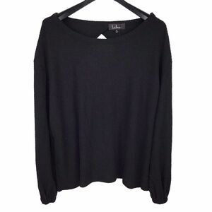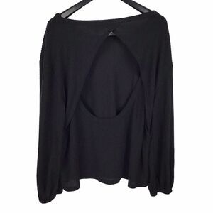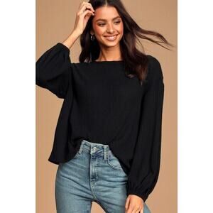 Lulus Jack of All Trades Black Waffle Knit Backless Top Boat Neck Oversize XL The Lulus Jack of All Trades Black Waffle Knit Backless Top is a little bit sexy, a little bit cozy, and a lot a bit cute! Soft, lightweight waffle knit, shapes this essential top with a boat neck, long balloons sleeves with drop shoulders and elasticized cuffs, and a relaxed, slightly oversized bodice. An overlapping, cutout open back adds a bit of drama Self: 95% Polyester, 5% Spandex.Hand Wash Cold. Do Not Bleach. Hang To Dry.Size: XLColor: BlackApprox. 25" across chest, 22" sleeve, 27" back length