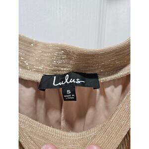 Lulus Jovial Occasion metallic gold maxi skirt, brand new with tags. Features a flattering high-rise waist, elegant metallic shimmer fabric, and a fully lined interior for comfort and smooth drape. Flowing maxi-length silhouette creates a refined, elevated look with beautiful movement.