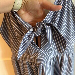 This fun piece is perfect for the upcoming spring and summer seasons. The dress features a blue and white pinstripe, bow front with peekaboo opening, zippered back, pockets, and lining. The piece is in good, pre-owned condition.