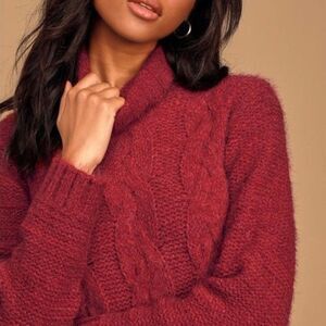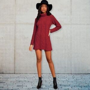 Lulus Joyous Cable knit Turtleneck Sweater Dress in Maroon. Ultra soft, medium weight cable knit is a fuzzy and warm eyelash knit that shapes a turtleneck and fitted long sleeves. Figure skimming bodice leads into a slightly flared mini hem. Contrasting ribbed knit accents the neck, cuffs and hem. New without tags. Sold out style! Size medium. Very short-would also be cute as a tunic with leggings!