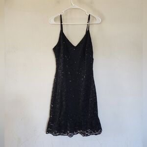 Sheer lace, with shiny black sequins throughout, shapes this sexy little dress that falls from adjustable spaghetti straps into a V-neckline and darted bodice. Back zip closure.