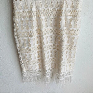 Lovely, white crochet lace overlays a cream, knit lining as it shapes a rounded neckline and darted, sleeveless bodice. Sheer, fitted waist tops a bodycon skirt with an adorable sheer fringe hem. Hidden back zipper/clasp.