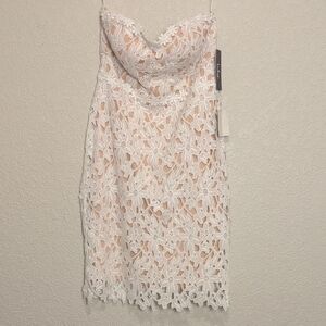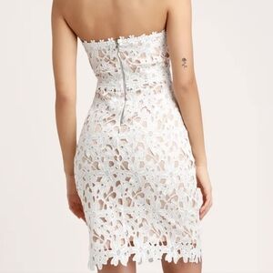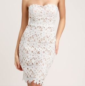 Lulus Key to my Heart white lace nude strapless bodycon midi dress