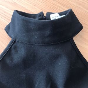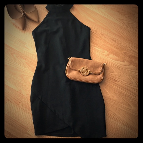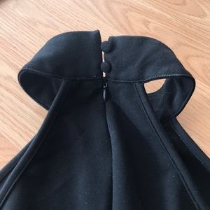 Little black dress with high neck and cross over hem line. There is a double button detail at back of neck and a Zip back closure. The model photos are of a very similar style dress Lulu’s currently sells, but this dress for sale does not have the side ruche detail