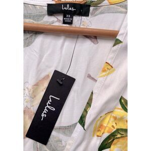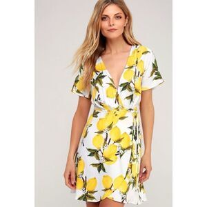 Stylish mini dress with lemon pattern. Wrap design with short sleeves. Ideal for sunny days.