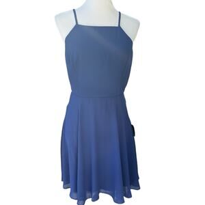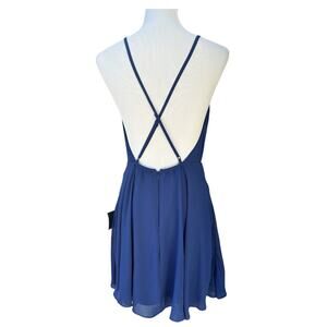 Lulu's Letter of Love Navy Blue Backless Skater Party Dress Size Large NWT. Lightweight woven chiffon falls from adjustable spaghetti straps that crisscross at back, into a high, apron neckline. Fitted waist and flirty skater skirt. Elastic at back for fit, and hidden zipper/clasp. Fully lined. Shell: 100% Polyester. Lining: 100% Polyester.