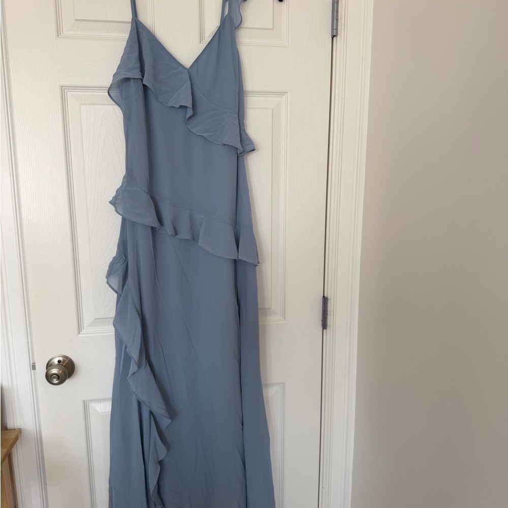 Chic light blue maxi dress with ruffle details. Perfect for elegant occasions.