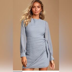 Lulus Light Blue Swiss Dot Long Sleeve Tie-Front Mini Dress size M