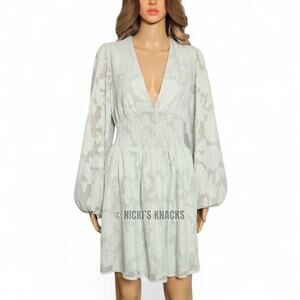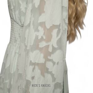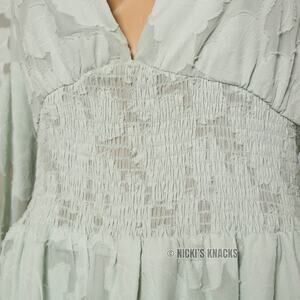Features: Deep V-neckline, long puff sleeves, smocked waist, burnout floral, lined
