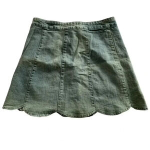 Pre owned light wash denim skirt with button fly. The tulip bottom hem detail is EVERYTHING😍