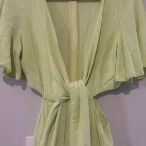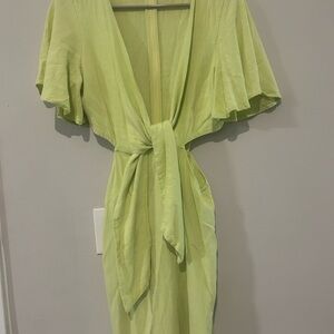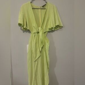 Chic midi dress with a stylish tie-front. Features flutter sleeves and side slits. Ideal for any event.