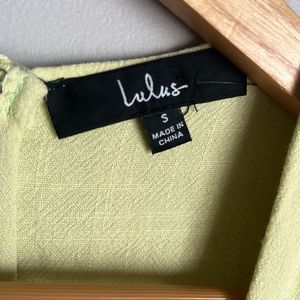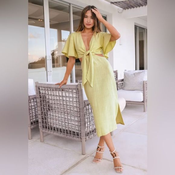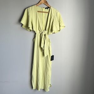 Chic lime midi dress with a tie-front design. Features flutter sleeves and a relaxed fit. Perfect for summer outings.