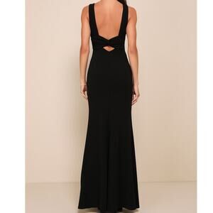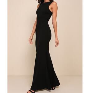 Lulus Love In Your Eyes Black Knotted Crew Neck Knit Mermaid Maxi Dress. Figure-loving stretch-knit, crew neckline, sleeveless bodice with knotted strap detail, open back, mermaid maxi skirt. Hidden back zipper/clasp. Fabric is very stretchy.
