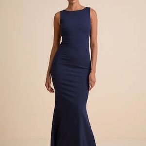 Simplicity meets iconic. Figure-loving stretch-knit crafts a classic boat neckline and a darted, sleeveless bodice with a knotted strap detail across the otherwise open back. The flattering mermaid maxi skirt lends a captivating blend of mystique and sophistication to the look. Hidden back zipper.