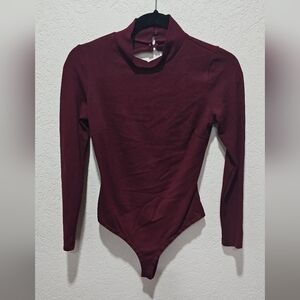 Lulus Love On Me Burgundy Backless Long Sleeve Bodysuit will always have your back! Medium-weight stretch knit falls from a mock neck, into fitted long sleeves and a darted bodice. A sexy, plunging back cutout with top buttons sits above thong bottoms with two snap closures. Keep things spicy with a midi skirt and ankle booties!