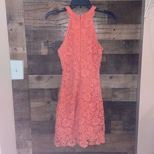 Lulu’s Love Poem Coral Orange Lace Mini Dress, size small. Excellent used condition. You'll be collecting notes from secret admirers right and left when you don the Lulus Love Poem Coral Orange Lace Mini Dress! A lively pattern of non-stretch crochet floral lace creates an eye-catching overlay atop knit fabric lining. Halter neckline and darted sleeveless bodice transition into a chic, sheath skirt with a mini. Hidden back zipper with clasp.