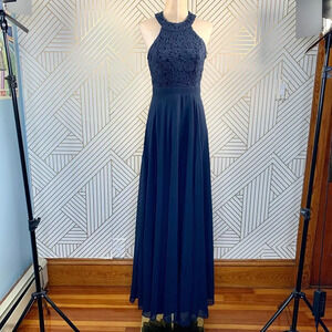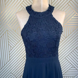 Brand new with tags Lulu's Love Poem Lace Halter Gown in Navy Blue. Crocheted lace covers the halter-style bodice in festive flowers on this flowing gown in a romantic design made for sweeping entrances.