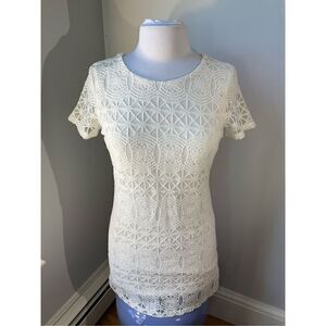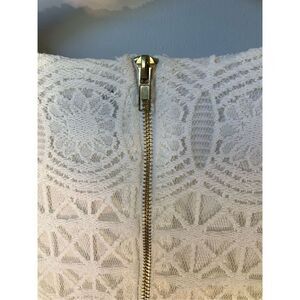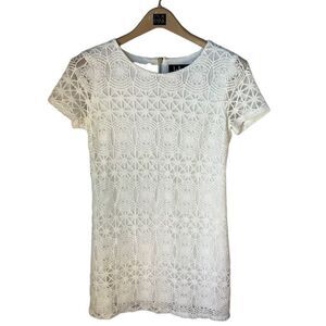 Lulus Love You For Eternity Lace Dress. White. XS. Short sleeve. Gold back zip closure. Lined bodice with sheer lace sleeves and hem. Minidress. Beautiful. Excellent condition. Self 75% cotton, 25% nylon. Lining 100% poly. Handwash. Flat lay 32” L, 16” P-P. #wedding #whitelacedress #lulus
