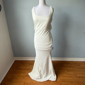 The sleek masterpiece that is this crepe knit bridal gown will have everyone swooning as you walk down the aisle. The sleeveless bodice features wide straps and a backless design, all atop a figure-flaunting, mermaid maxi skirt with a fitted waist and a subtle train. An oversized bow at the back perfectly completes the look, just how you envisioned it. Hidden back zipper/clasp.