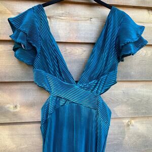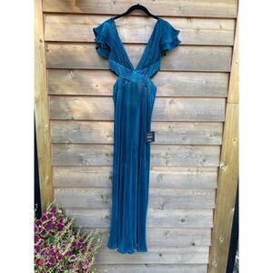 Lulus Luxe Decision Dark Teal Plisse Satin Cutout Wide-Leg Jumpsuit