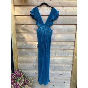 Plisse, stretch-woven satin shapes this stunning jumpsuit that features tiered flutter sleeves, a plunging V-neckline (and back), and a lightly gathered bodice.