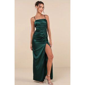 Lulus Luxurious Marvel Emerald Satin Ruched Column Maxi Dress Green Large