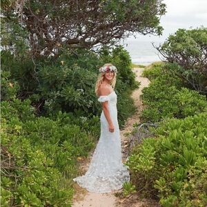 The best way to celebrate the start of the rest of your life is with the Lulus Magical Beginnings White 3D Floral Embroidered Maxi Dress! A sheer lace-like mesh overlay (atop a matching knit liner) boasts an array of floral embroidery and floral applique details that lend a lace-like, 3D effect throughout this stunning dress. Short puff sleeves (with elastic at the shoulders and cuffs) frame the off-the-shoulder bodice and a sweetheart neckline with hidden no-slip strips. The high, fitted waist tops a figure-flaunting skirt that boasts a mermaid-style silhouette as it falls to a maxi hem with a romantic train at the back. Hidden back zipper/clasp.