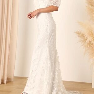 The best way to celebrate the start of the rest of your life is with the Lulus Magical Beginnings White 3D Floral Embroidered Maxi Dress! A sheer lace-like mesh overlay (atop a matching knit liner) boasts an array of floral embroidery and floral applique details that lend a lace-like, 3D effect throughout this stunning dress. Short puff sleeves (with elastic at the shoulders and cuffs) frame the off-the-shoulder bodice and a sweetheart neckline with hidden no-slip strips. The high, fitted waist tops a figure-flaunting skirt that boasts a mermaid-style silhouette as it falls to a maxi hem with a romantic train at the back. Hidden back zipper/clasp.