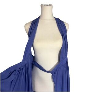 The Lulus Magical Movement Periwinkle Blue Wrap Maxi Dress in size small is a stunning long dress featuring a sleeveless design with a halter neckline and a tie closure. Made of rayon material, this solid blue dress has a maxi length and wrap design. It is recommended to dry clean only as it is a high-quality garment from the reputable brand Lulus, known for its fashionable and trendy women's clothing. Perfect for special occasions or a night out, this dress is sure to make a statement with its chic style and elegant design.