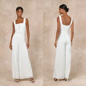 Lulus Majorly Iconic White Swiss Dot Ruffled Lace-Up Jumpsuit S Wedding Party. New without tags. See all pictures for details.