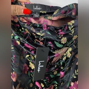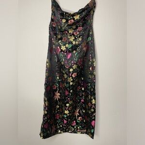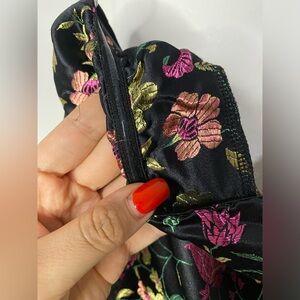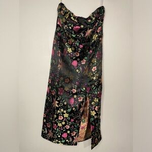 Move with confidence knowing no one could resist you in the Lulus Make a Move Black Satin Floral Jacquard Strapless Midi Dress! Sleek woven satin, with a gorgeous metallic green, pink, purple, and yellow floral brocade design, sweeps from a straight strapless neckline (with hidden no-slip strips) into a tailored, seamed bodice. High waist tops off the midi skirt with a column silhouette and a sexy thigh-high side slit. Hidden side zipper/clasp.