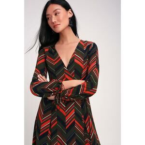 A lively chevron print (in shades of orange, red, navy blue, white, and brown) decorates lightweight woven fabric to form a surplice neckline (with modesty snap) and long sleeves with tying cuffs. A fitted waist, decorated with a tying detail, tops off the wrapped, slightly flared midi skirt. Hidden back zipper/clasp.