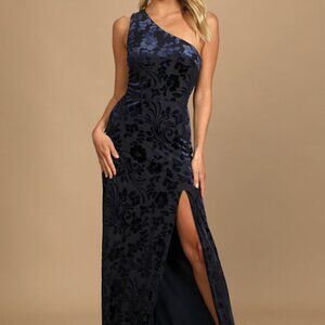 Lulus Marvelous Moi Navy Blue Burnout Velvet One-shoulder Maxi Dress - Size S
