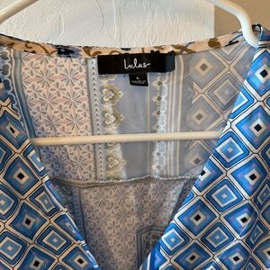Lulus, Matching Mykonos Blue Scarf Print Tie-Front long sleeve top (L) and shorts (L)