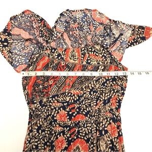 Mixed floral print. Colors include Navy blue, tan, and fire red-orange. Gauze material, 100% Polyester. Unlined.