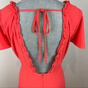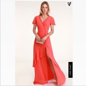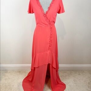 Coral Ruffle Dress with Front Slit. Fully Lined. Excellent Condition. Length is 61”