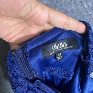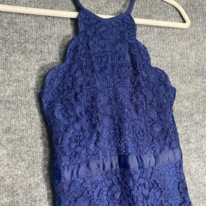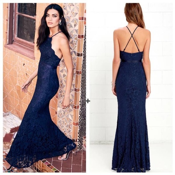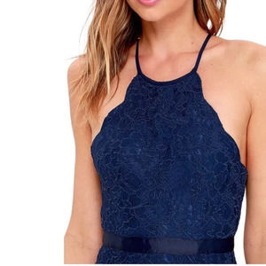 Lulus Maxi Gown Dress XS Navy Blue Lace Zenith Trumpet Hem Cocktail Formal MSRP $92