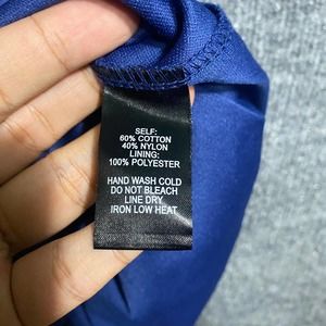 Features: navy blue maxi dress, trumpet gown style, high neck, scalloped neckline, fitted silhouette, crossed back straps, adjustable straps, back zipper, fully lined