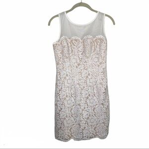 The Lulus Me and You White Bodycon Lace Dress is all you need for a romantic evening for two! Sheer white mesh shapes a rounded neckline and decolletage atop this stunning eyelash lace dress (with nude, stretch knit lining). Darted, sleeveless bodice carries into a fitted waist, and bodycon skirt, while scalloped detail accents the mini hem. Hidden side zipper/clasp.
