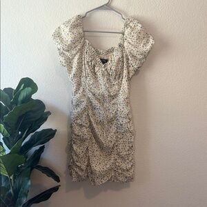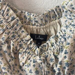Lulus size medium dainty blue floral print dress. Cream color dress fully lined. Puff sleeves can be worn on or off shoulders. Flattering rouched fitting. Side zipper closure.