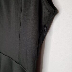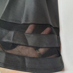 Black fit and flare mini dress. Sleeveless with side zip. Mesh striped panels at the neckline and hem.