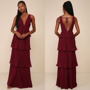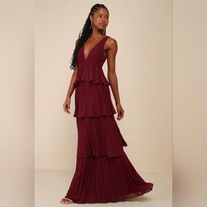 Lulus Mesmerizing Essence Burgundy Pleated Backless Tiered Maxi Dress Wedding NWOT. See all pictures for details. Currently SOLD OUT online.