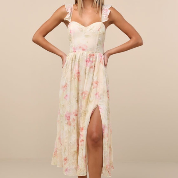 Lulus Miara Cream And Pink Floral Embroidered Ruffled Midi Dress White - Size XL