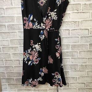 is the perfect dress to wear from day into the night! Woven rayon, with a charming black, pink, blue and white floral print, shapes a sleeveless, wrapping bodice. Tying sash belt tops a flirty skater skirt. Unlined.