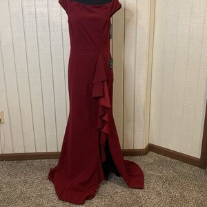 Lulu’s Mila Burgundy Ruffled Off The Shoulder Maxi Dress, size medium. NWT.
