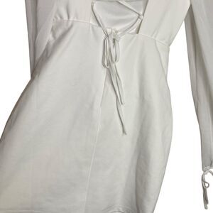 You're sure to sweep them off their feet every time when you're wearing the Lulus Delightful Love White Lace-Up Balloon Sleeve Mini Dress! Stretchy, midweight crepe knit fabric shapes this darling dress that has long, semi-sheer sleeves with elastic at the shoulders and cuffs with tie details. Fitted bodice features a square neckline and a flattering, seamed design with a sultry lace-up back. Bodycon skirt finishes at a mini hem. Hidden zipper/clasp at back.