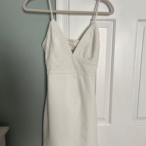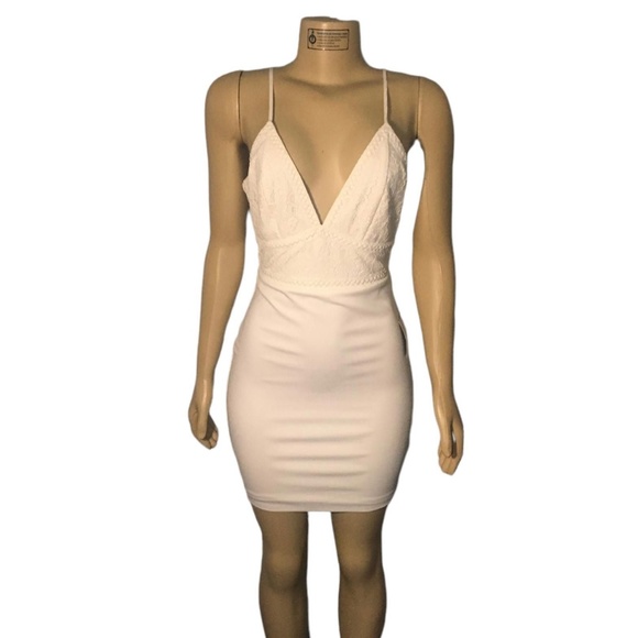 Lulus: mini white (not a bright white) mini bodycon spaghetti strap dress. Size Small. Style DH24810ED PO#30271 RN#113395. Measures approximately: Length 29", Hips 16 1/4", Across Chest (15" **lace area with no stretch**).