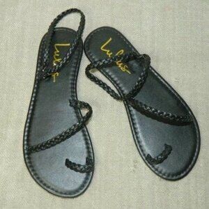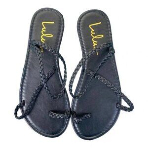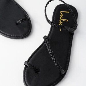 Lulus Mirela Black Flat Sandals Vegan Leather Braided Straps Size 8.5 NIB