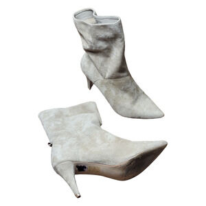 Lulus “Morgana 1” heeled booties in neutral taupe gray faux suede. Features a pointed toe, stiletto heel, and gathered fold-over ankle cuff with oversized gold button fastener at the back. Faux leather upper, sleek minimalist style with a touch of sophistication. Excellent pre-owned condition (EUC) with no flaws. Stylish neutral booties that work with capsule wardrobes, night-out outfits, or office chic looks.