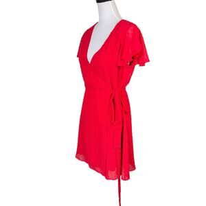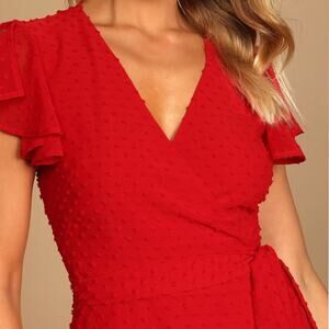 Lulus Much to Celebrate Red Swiss Dot Flutter Sleeve Wrap Mini Dress